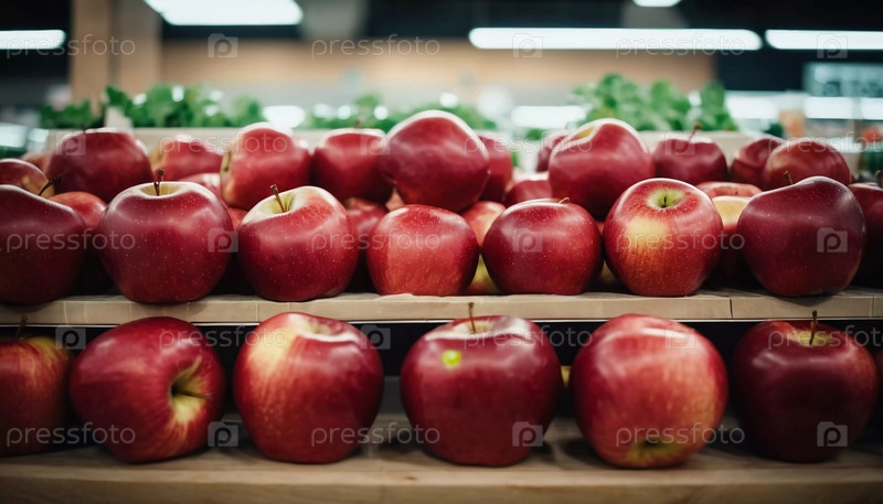 Красочный ассортимент красных яблок аккуратно размещен на прилавке супермаркета, приглашая клиентов исследовать и выбирать свежие фрукты