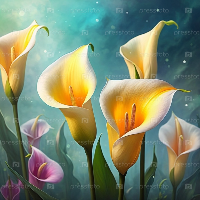 Группа изящных калла-лилий появляется на фоне очаровательного красочного неба, демонстрируя свои грациозные кривые и мягкое свечение в час сумерек