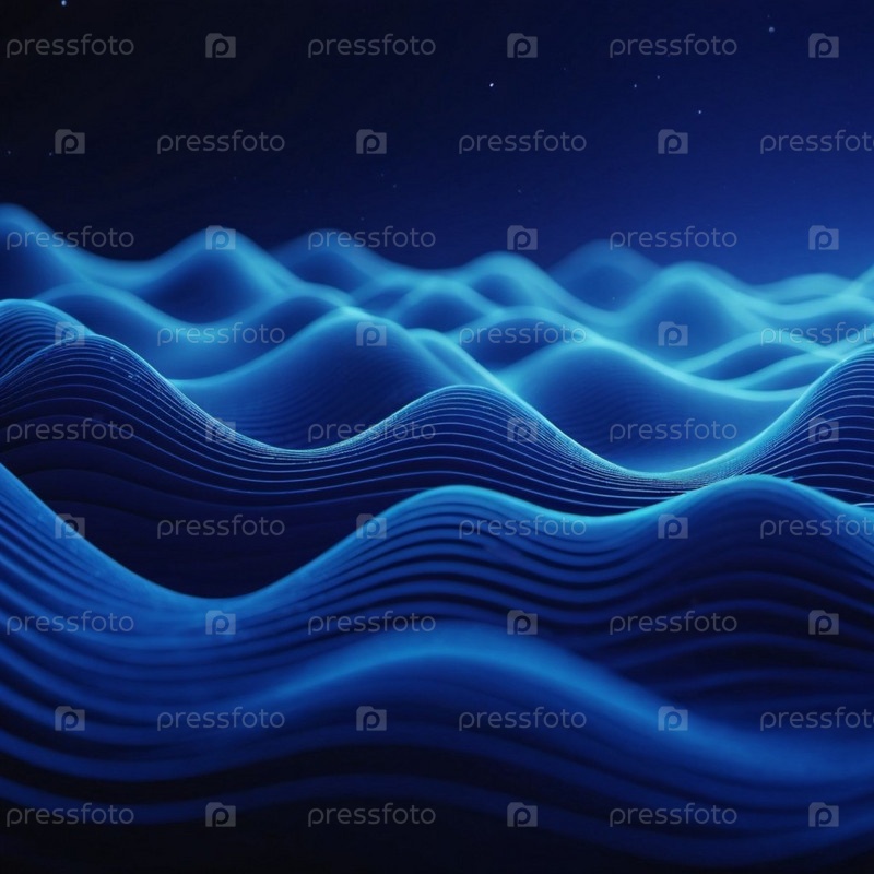 Плавучие 3D-синие волны создают абстрактное представление динамики жидкостей, вызывая спокойствие и глубину в минималистическом дизайне, который улучшает цифровое творчество