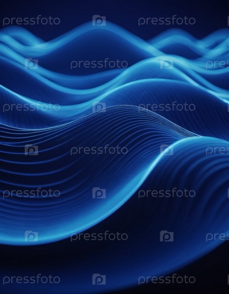 Плавучие 3D-синие волны создают абстрактное представление динамики жидкостей, вызывая спокойствие и глубину в минималистическом дизайне, который улучшает цифровое творчество