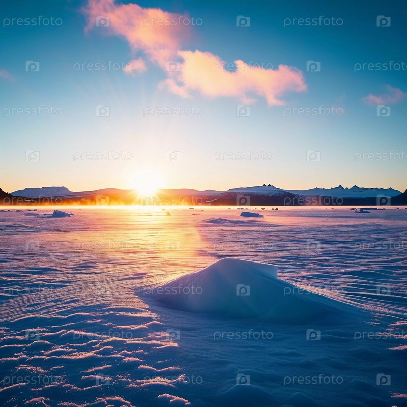 Спокойный арктический ландшафт тундры покрыт морозом при восходе солнца, бросая золотой свет на ледяную местность и освещая нежные морозные образования