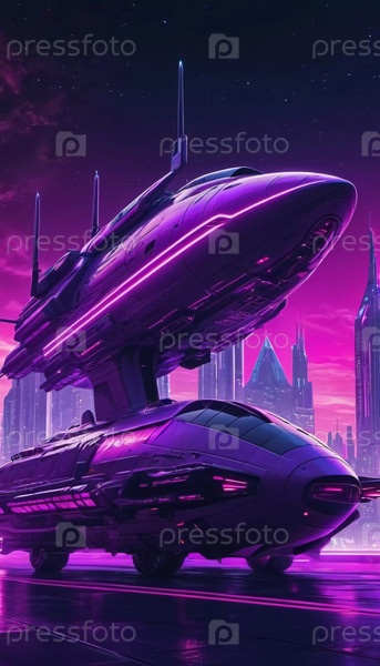 Футуристические космические корабли навигируют по завораживающей вселенной, наполненной неоновыми оттенками, демонстрируя передовые технологии среди сияющих городских пейзажей