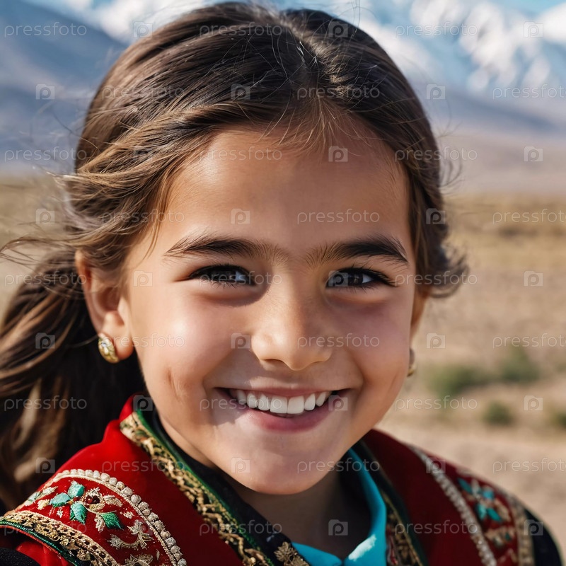 Молодая улыбающаяся 5-летняя девочка таджикской национальности стоит на улице, одетая в традиционную одежду