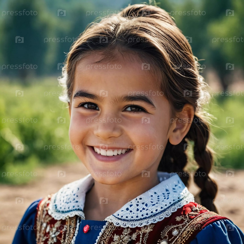 Молодая улыбающаяся 5-летняя девочка таджикской национальности стоит на улице, одетая в традиционную одежду
