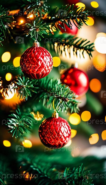 Красочные рождественские украшения украшают ветви елки, яркие шары в оттенках красного и розового цвета, олицетворяющие праздничное настроение зимой