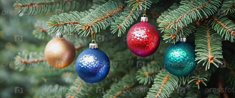 Красочные рождественские украшения украшают ветви елки, яркие шары в оттенках красного, синего, зеленого, золотого и розового цветов, олицетворение праздничного настроения