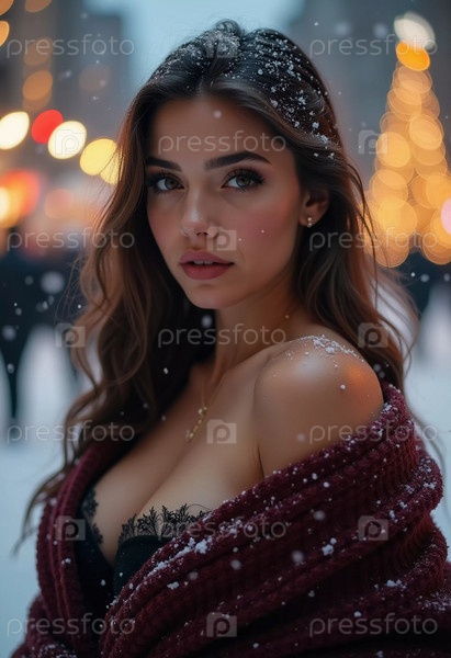 Потрясающая женщина смотрит нежно, когда вокруг нее падают снежинки в восхитительной городской обстановке, захватывая магию рождественского сезона