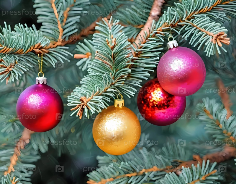 Сверкающие декоративные шары в ярко-красном и золотом цветах висят на ветке пышной ель. Мягкие, теплые огни мерцают, улучшая праздничный дух Рождества. Счастливого Нового года. Художественный рисунок. Генерация ИИ