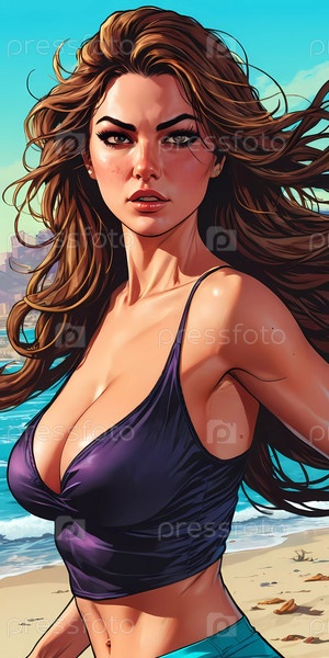 Женщина наслаждается напряженным днем на пляже, бегает вдоль береговой линии в купальнике, ее длинные волосы свободно текут в океаническом бризе, а волны мягко хлопают ей в ноги