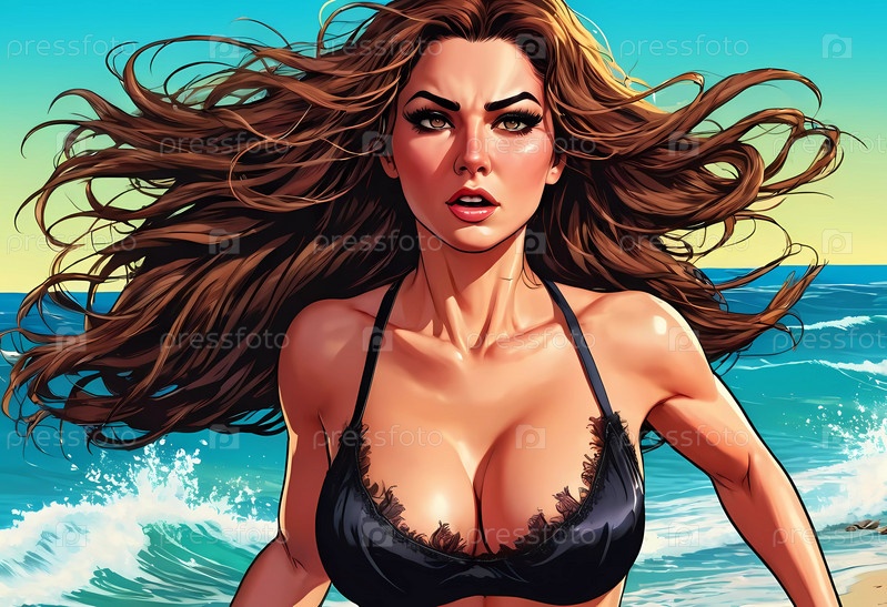 Женщина наслаждается напряженным днем на пляже, бегает вдоль береговой линии в купальнике, ее длинные волосы свободно текут в океаническом бризе, а волны мягко хлопают ей в ноги