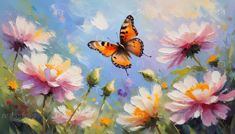 Красочные бабочки грациозно парили над ярким массивом диких цветов, создавая живую и веселую атмосферу на солнечном лугу