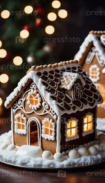 Праздничный дом из пряников выделяется на тарелке, украшенной мороженым, конфетами и снежными ювелирными изделиями. Он отражает дух рождественской выпечки, окруженный веселой атмосферой