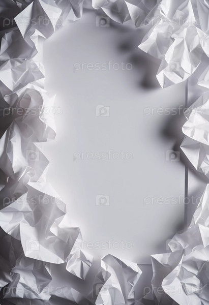 Сжатая белая бумага образует текстурированную границу вокруг пустого пространства, приглашая творчество писать, рисовать или проектировать проекты в чистом минималистическом стиле