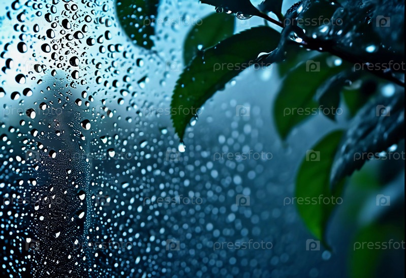 Капли дождя цепляются за стекло окна, создавая успокаивающую атмосферу.На заднем плане размытая зелень изображает тихий дождливый день, наполненный красотой природы.Генерирование AI