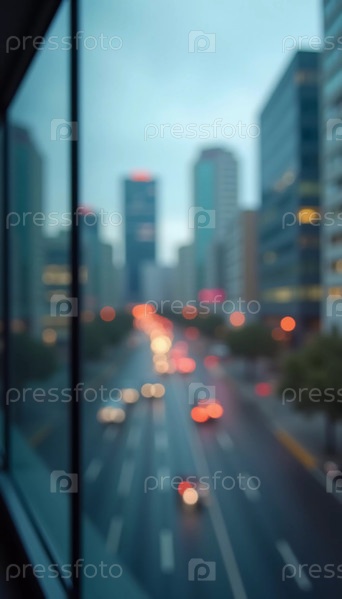 Размытая перспектива показывает современный городской горизонт через стеклянную стену во время заката, раскрывая динамику и сложность городской жизни. угасающий свет отражает энергию города