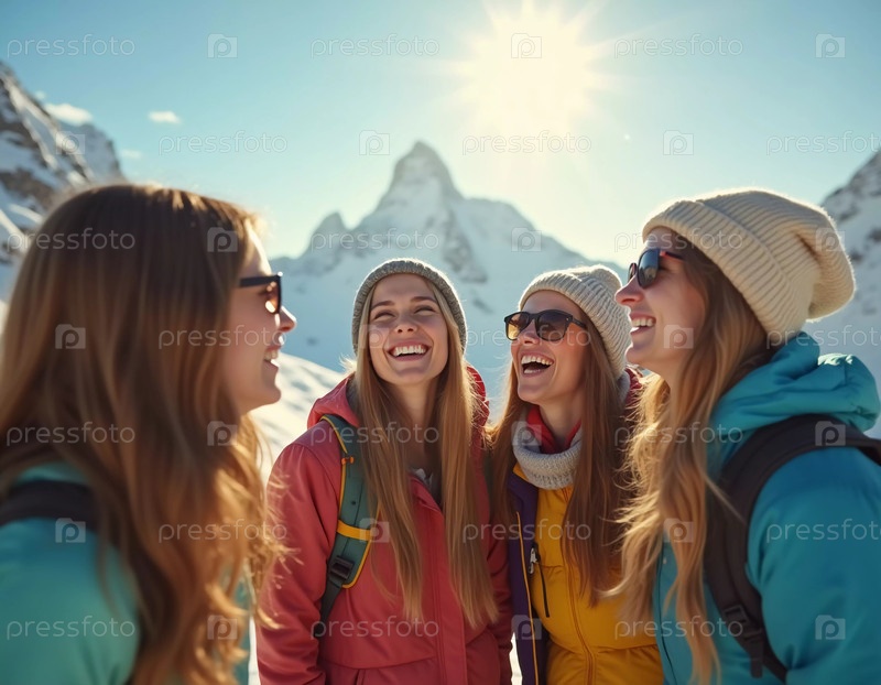 Друзья наслаждаются солнечным днем на горнолыжном курорте, улыбаясь и смеясь, пока они снимают веселый момент вместе