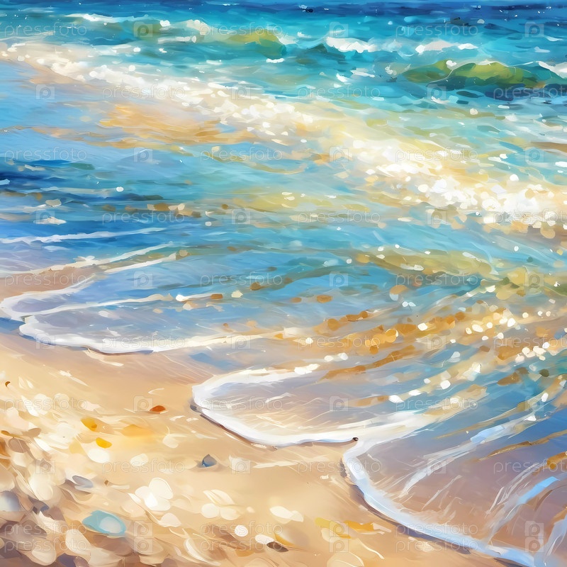 Потрясающий летний фон имеет берег мягкого песчаного пляжа рядом с ярко-синим морем. солнечный свет светит на поверхность воды, создавая спокойную атмосферу. живопись. генерация ИИ