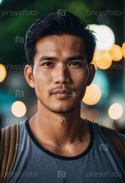 Молодой человек, живущий в Таиланде, уверенно стоит с спокойным выражением лица.Фон заполнен мягкими лампами боке, которые создают привлекательную атмосферу на протяжении вечера