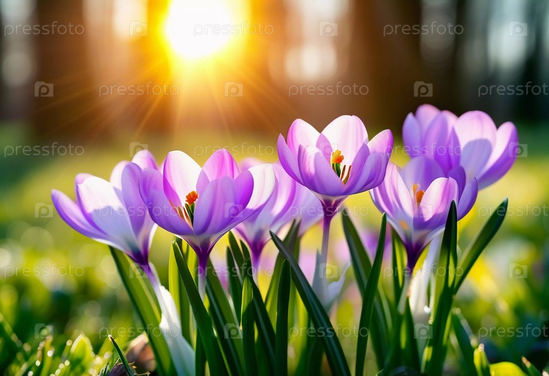 Нежные розовые цветы крокуса расцветают в пышной зеленой траве, солнечный свет в спокойной весенней обстановке. Возрождение природы. Шафран Крокус - род многолетних луковичных травных растений семейства Iris Iridaceae