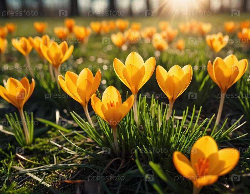 Деликатные желтые цветы крокуса расцветают в пышной зеленой траве, солнечный свет в спокойной весенней обстановке. Возрождение природы. Шафран Крокус - род многолетних луковичных травных растений семейства Iris Iridaceae