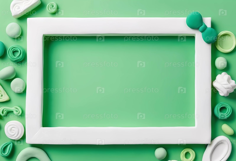 Прямоугольная рама пуста на ярко-зеленом абстрактном фоне, вокруг нее различные белые и зеленые декоративные элементы создают игривую атмосферу для дизайна