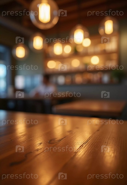 Теплый деревянный стол создает уютную атмосферу в шумном кафе. Мягкие огни освещают фон, где посетители наслаждаются напитками и разговорами