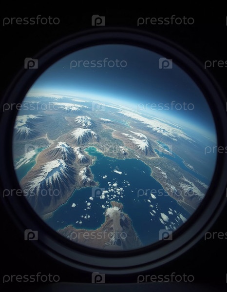 Наблюдение за планетой Земля через окно предлагает захватывающий вид на покрытые снегом горы, безмятежные океаны и рассеянные облака, подчеркивая красоту планеты сверху