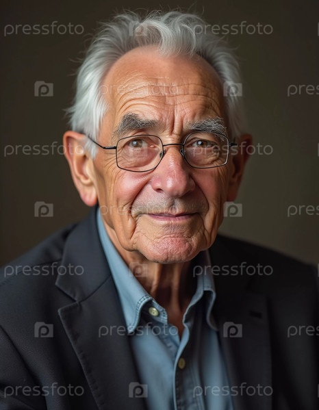 Пожилой мужчина, житель США, с белыми лучами волос счастливо демонстрирует свое дружелюбное поведение в повседневной одежде