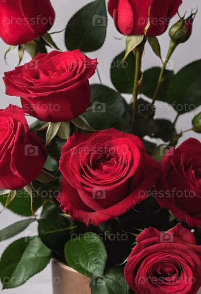 Букет ярко-красных роз изящно стоит в декоративной вазе, окруженной богатыми зелеными листьями, создавая потрясающий центральный элемент, идеально подходящий для любого случая