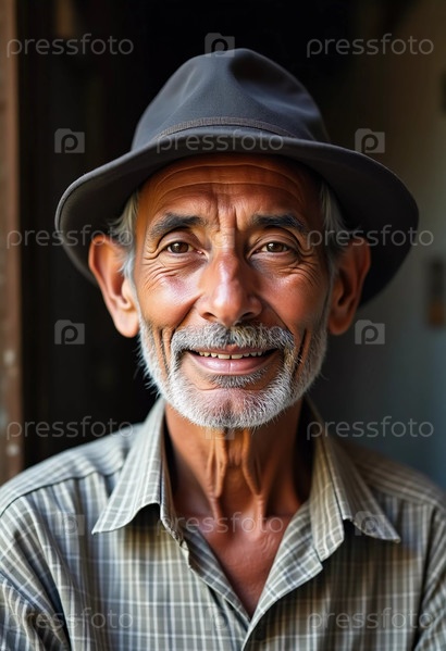Веселый пожилой мужчина стоит в мягко освещенной двери, одетый в стильную шляпу.Его теплая улыбка отражает жизнь, наполненную историями, воплощающими богатое культурное наследие его азиатского окружения