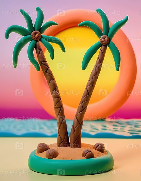Построенные из яркой игровой Дохи, эти пальмы высоко стоят на фоне мечтательного заката, создавая причудливую сцену творчества и веселья в сумерках