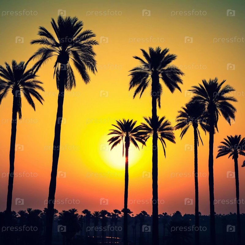 Когда заходит солнце, лучи золотистого света фильтруют силуэты пальмовых деревьев, рисуя небо оранжевыми и фиолетовыми оттенками