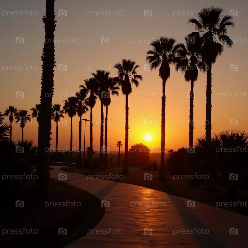 Когда день превращается в ночь, пальмы стоят высоко вдоль извилистой тропы, создавая потрясающий закат солнца, который бросает теплые золотые оттенки по небу и ландшафту