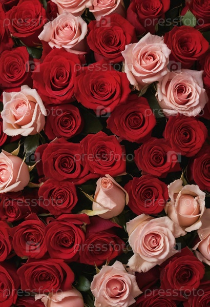 Красивое расположение пышных красных и мягких розовых роз заполняет рамку, демонстрируя свои богатые цвета и нежные цветы, создавая очаровательный фон, который говорит о романтике