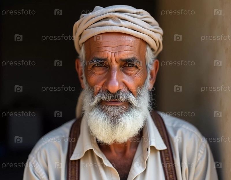 С длинной белой бородой и глубокими глазами йеменский человек размышляет о своем богатом наследии, одетый в традиционную одежду, освещенный мягким светом сумерек генеративного ИИ