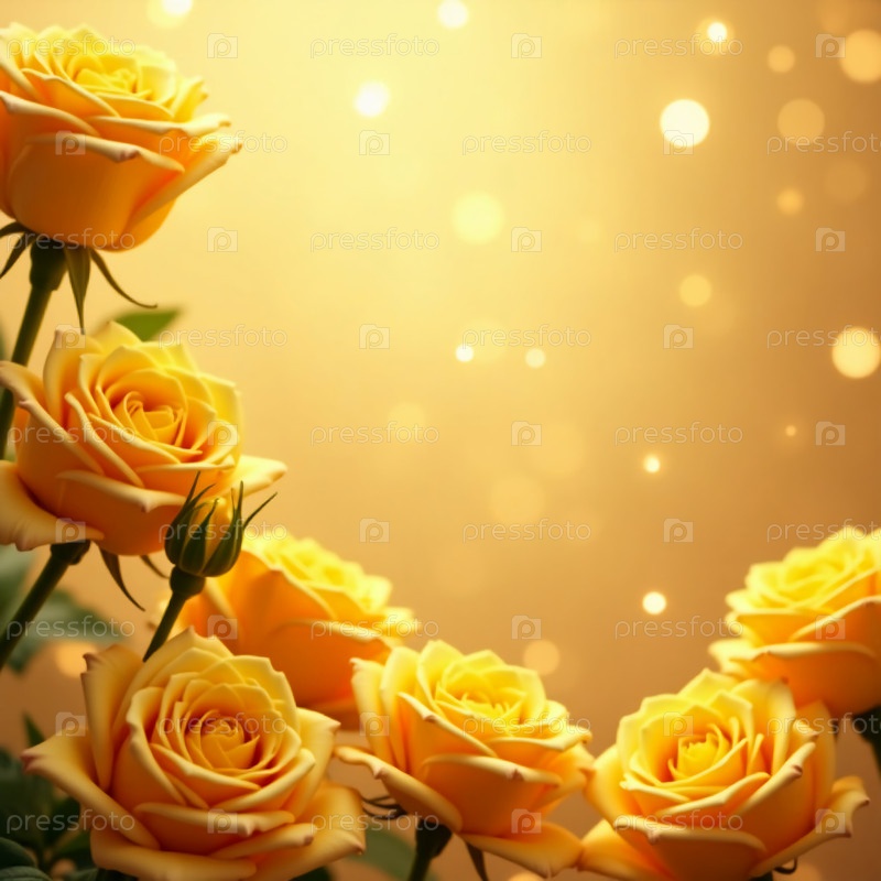 Нежные желтые розы ярко цветут, создавая захватывающее отображение тепла и красоты на фоне блестящего бокеха с мигающими мягкими золотистыми оттенками ощущение магии чистое пространство