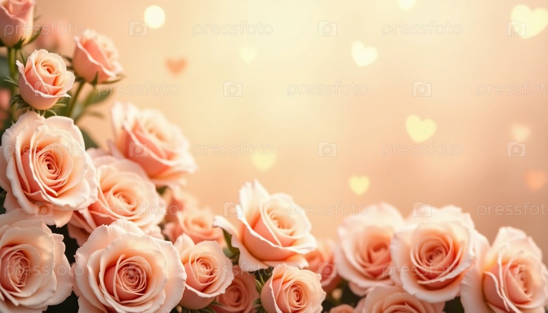 Нежные бежево-розовые розы цветут изящно, их лепестки мягкие и привлекательные, поскольку они наполняют сцену теплом и очарованием.This Heartbreaking Composition Offers Enough Clean AI Space