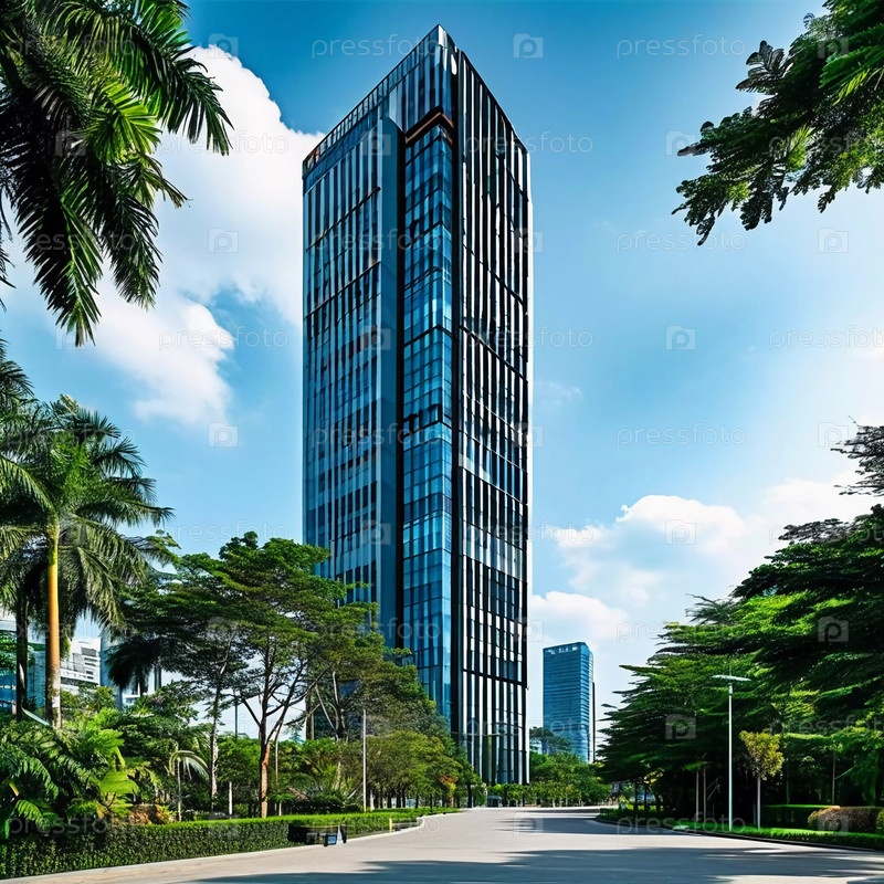 Яркий солнечный свет освещает гладкий небоскреб, окруженный тропическими деревьями, демонстрируя гармоничное сочетание природы и городской архитектуры в яркой городской атмосфере