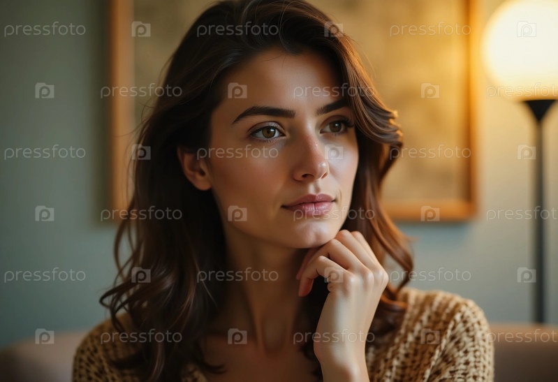 Женщина задумчиво сидит на диване в теплой, приглашающей комнате