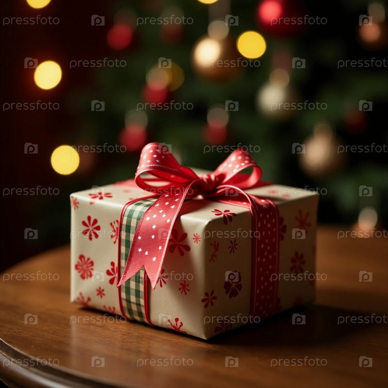 Красиво упакованный подарок с красными луками и праздничными узорами сидит на полированном деревянном столе, аккуратно освещенном близлежащей рождественской елкой в течение праздничного сезона