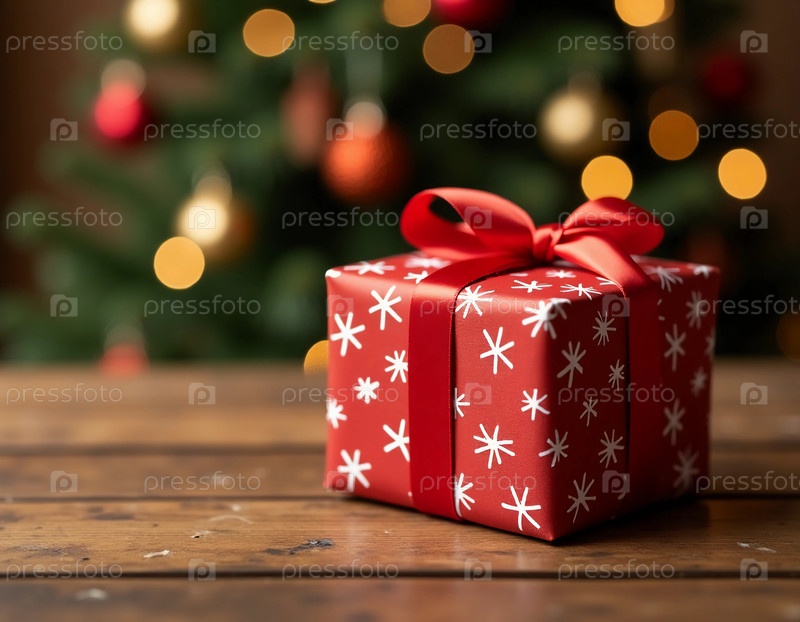 Очаровательный подарок, красиво упакованный в праздничную красную бумагу с белыми снежинками, лежит на деревянном столе.Мягкие огни рождественской елки создают теплую и радостную атмосферу