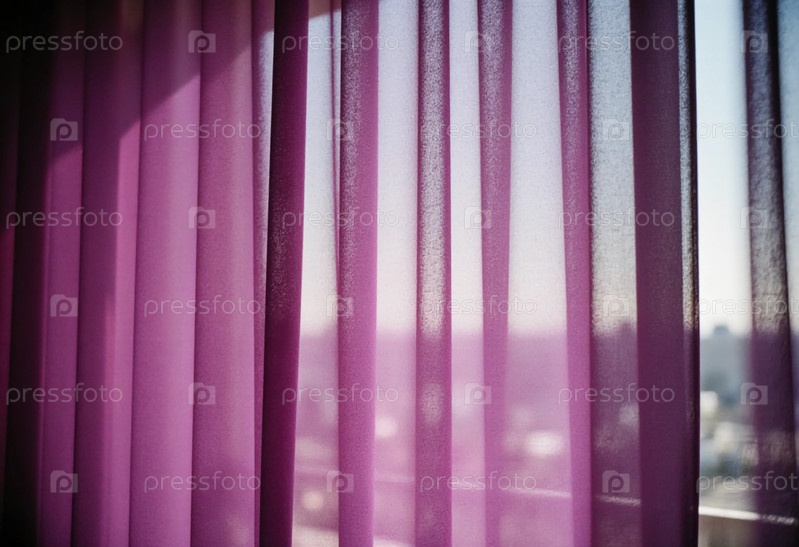 Солнечный свет проникает сквозь нежные фиолетовые лилии занавески, создавая мягкое свечение внутри светлой комнаты
