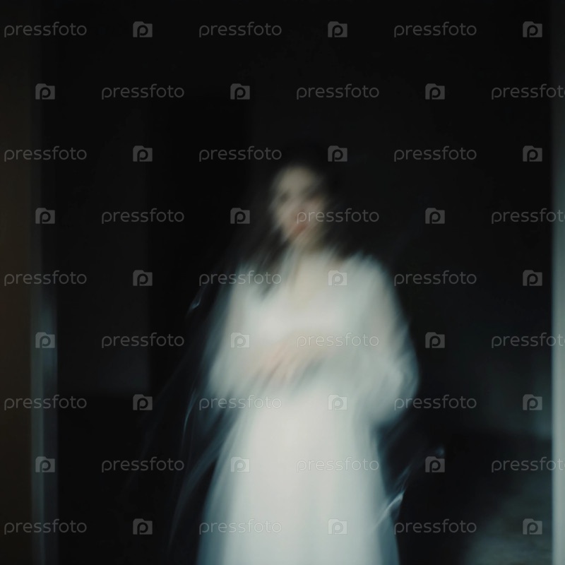 Таинственная фигура в белом платье появляется в слабо освещенной комнате, создавая жуткую атмосферу. размытые края добавляют эффект призрака и усиливают охлаждающее чувство генеративного ИИ