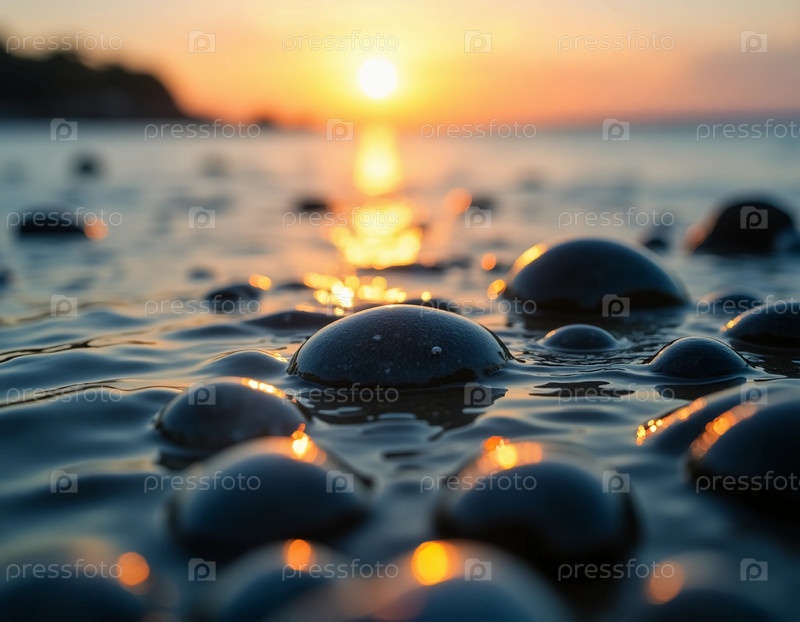 Скалистые камни сверкают утренней росой, когда солнце проникает в горизонт и бросает золотые оттенки через спокойную воду.Природа просыпается в мирном объятии света