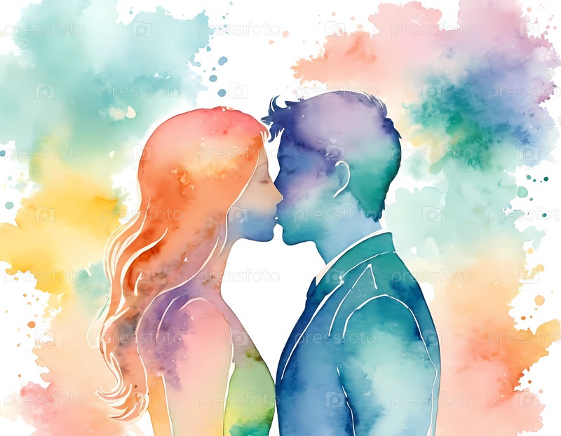 Молодая пара делится романтическим поцелуем в живом акварельном искусстве, отмечая любовь и связь среди брызги цветов