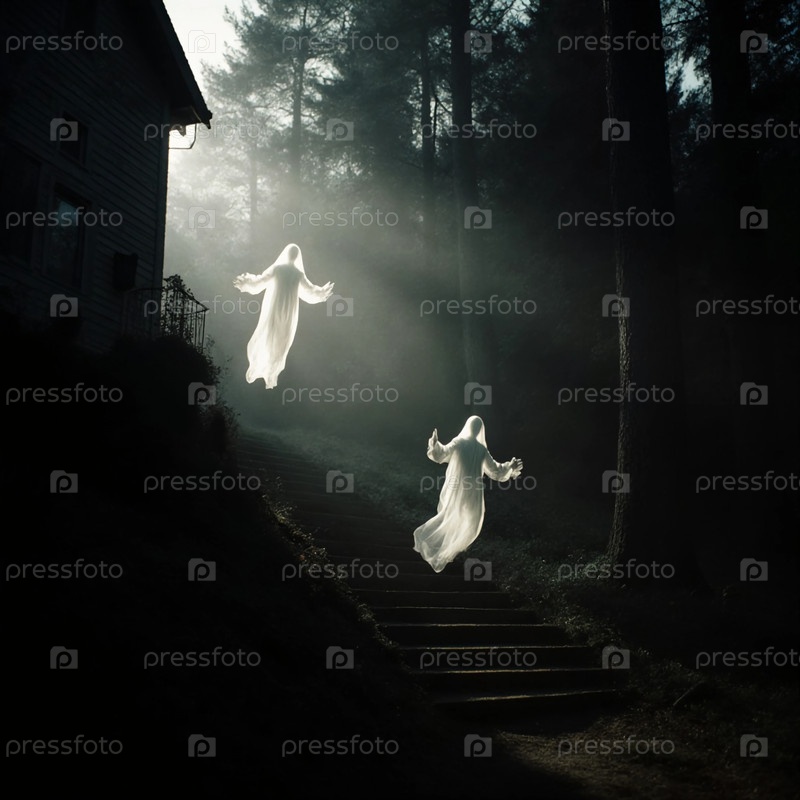 Два эфирных призрака плывут по лестнице в темном лесу, окруженный туманом и деревьями.Странная атмосфера создает жуткую сцену Хэллоуина, которая захватывает воображение генеративного ИИ