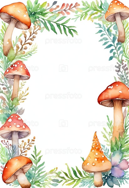 Живая коллекция причудливых грибов, окрашенных в акварель, создает живую границу вокруг пустой области генеративного ИИ