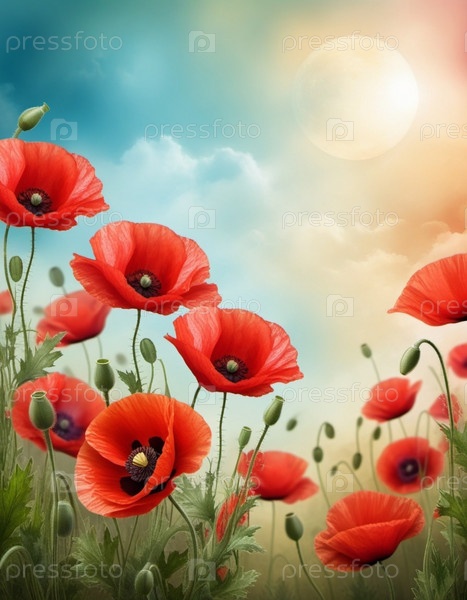 Красный мак с зелеными листьями и стеблями.Маки изображаются на различных стадиях цветения, некоторые полностью открыты, а другие в зародыше.Мягкая спина, создающая деликатное и романтическое ощущение