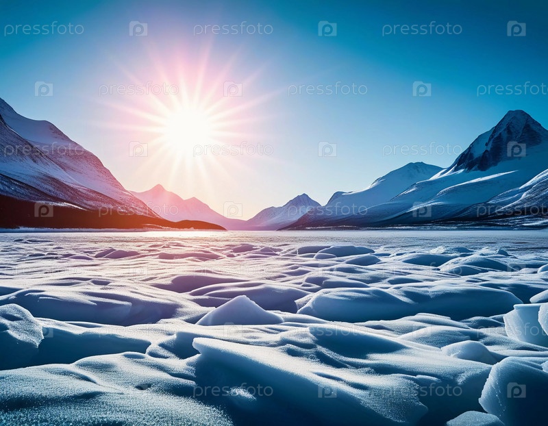 Спокойный арктический ландшафт тундры покрыт морозом при восходе солнца, бросая золотой свет на ледяную местность и освещая нежные морозные образования