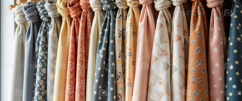 Замысловатые узлы занавесок грациозно висят в текстильном магазине, демонстрируя яркий массив цветов, узоров и текстур при дневном свете